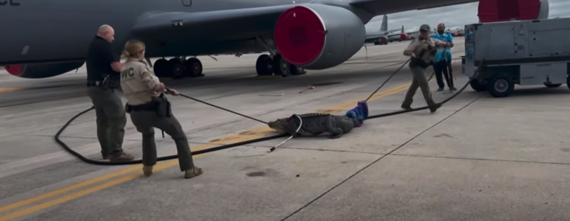 Στελέχη της βάσης εντόπισαν έναν τεράστιο αλιγάτορα κουρνιασμένο στο σύστημα προσγείωσης ενός αεροσκάφους εναέριου ανεφοδιασμού KC-135.