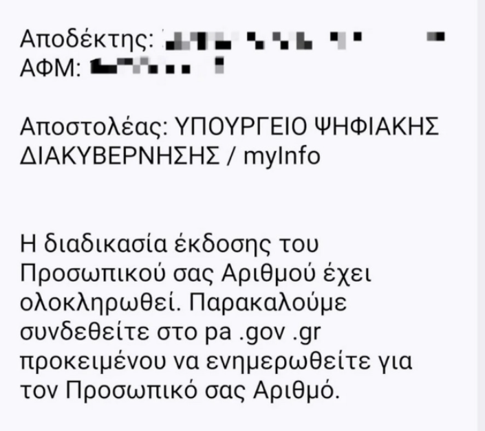 Πολλοί πολίτες λοιπόν έλαβαν αυτό το ενημερωτικό μήνυμα, το οποίο τους καθοδηγεί να επισκεφθούν την επίσημη πλατφόρμα προκειμένου να δουν τον νέο τους Προσωπικό Αριθμό.