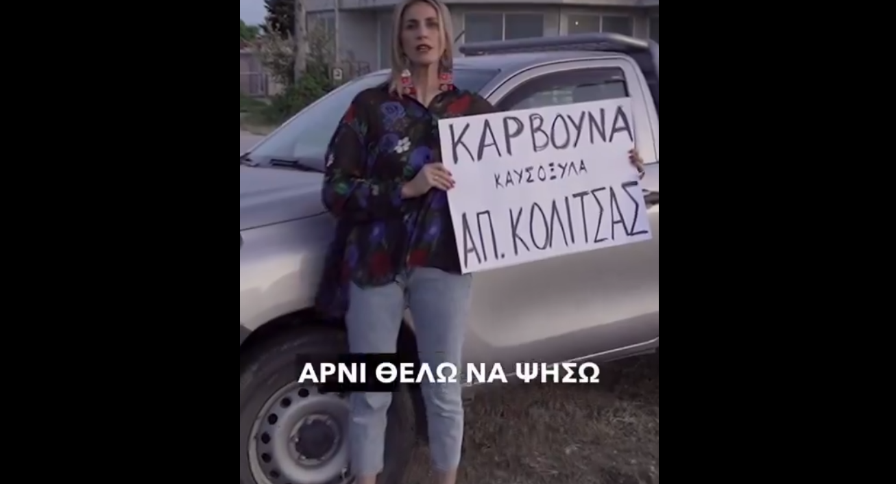 Η ερμηνεύτρια κρατάει ένα χαρτόνι που γράφει «Κάρβουνα, καυσόξυλα, Απ. Κολίτσας».