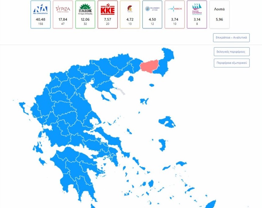 Νίκη της Νέας Δημοκρατίας με διαφορά μεγαλύτερη του 22% από τον ΣΥΡΙΖΑ και ισχυρή αυτοδυναμία δίνουν τα πρώτα αποτελέσματα Επικρατείας του Υπουργείου Εσωτερικών για τις σημερινές εκλογές της 25ης Ιουνίου στο 97,06% της ενσωμάτωσης.
