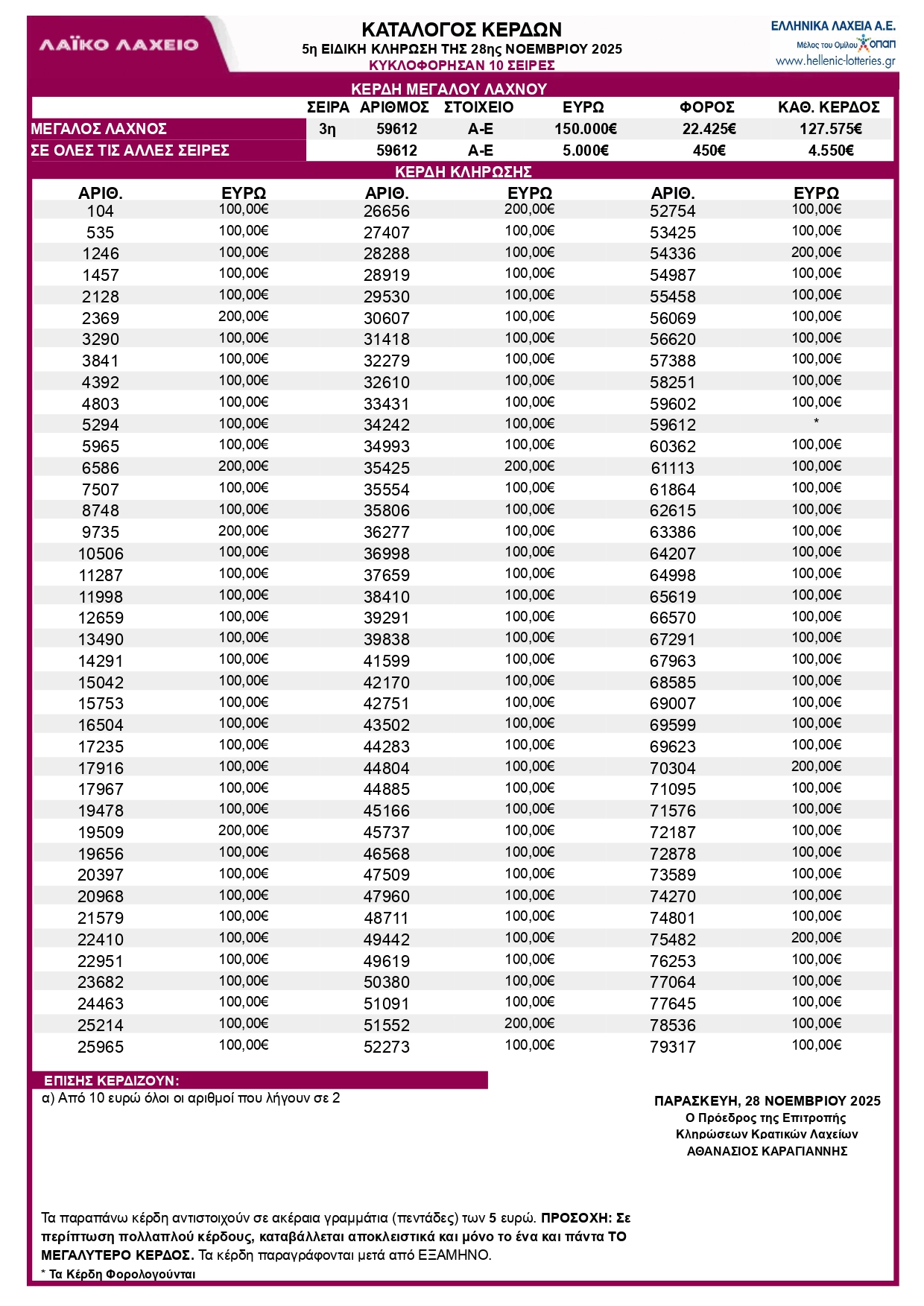 Ο τυχερός λαχνός είναι 59612, σειρά 3, που κερδίζει 150.000 ευρώ η πεντάδα. Οι λαχνοί με τον ίδιο αριθμό σε όλες τις άλλες σειρές κερδίζουν 5.000 ευρώ η πεντάδα.