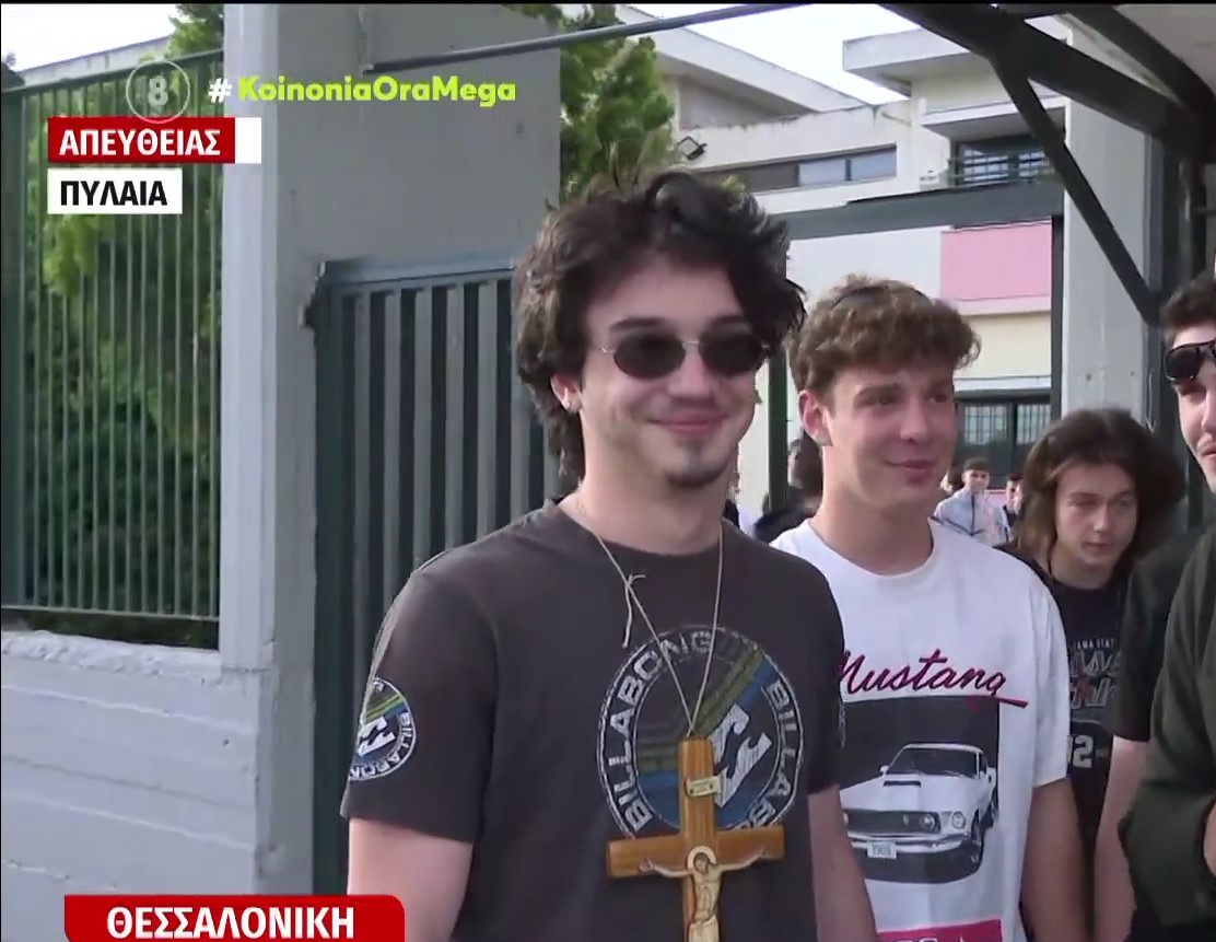 Συγκεκριμένα, ο Παναγιώτης, μαθητής του 1ου Λυκείου Πυλαίας στη Θεσσαλονίκη, εμφανίστηκε με έναν τεράστιο σταυρό κρεμασμένο στον λαιμό του.