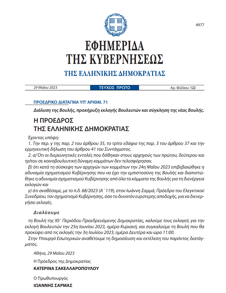 Θυροκολλήθηκε το Προεδρικό Διάταγμα διάλυσης της Βουλής, με το οποίο προκηρύσσονται εθνικές εκλογές στις 25 Ιουνίου.